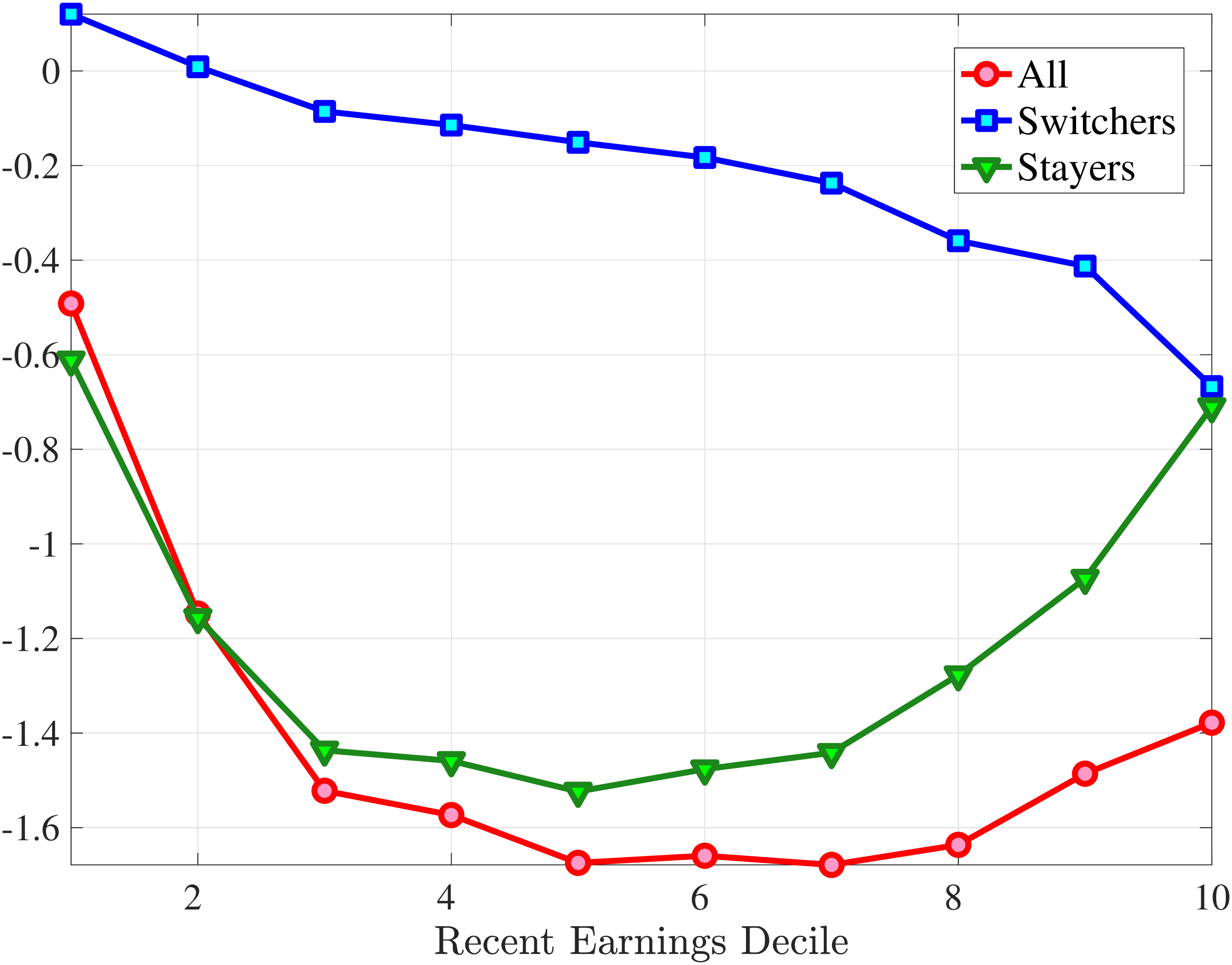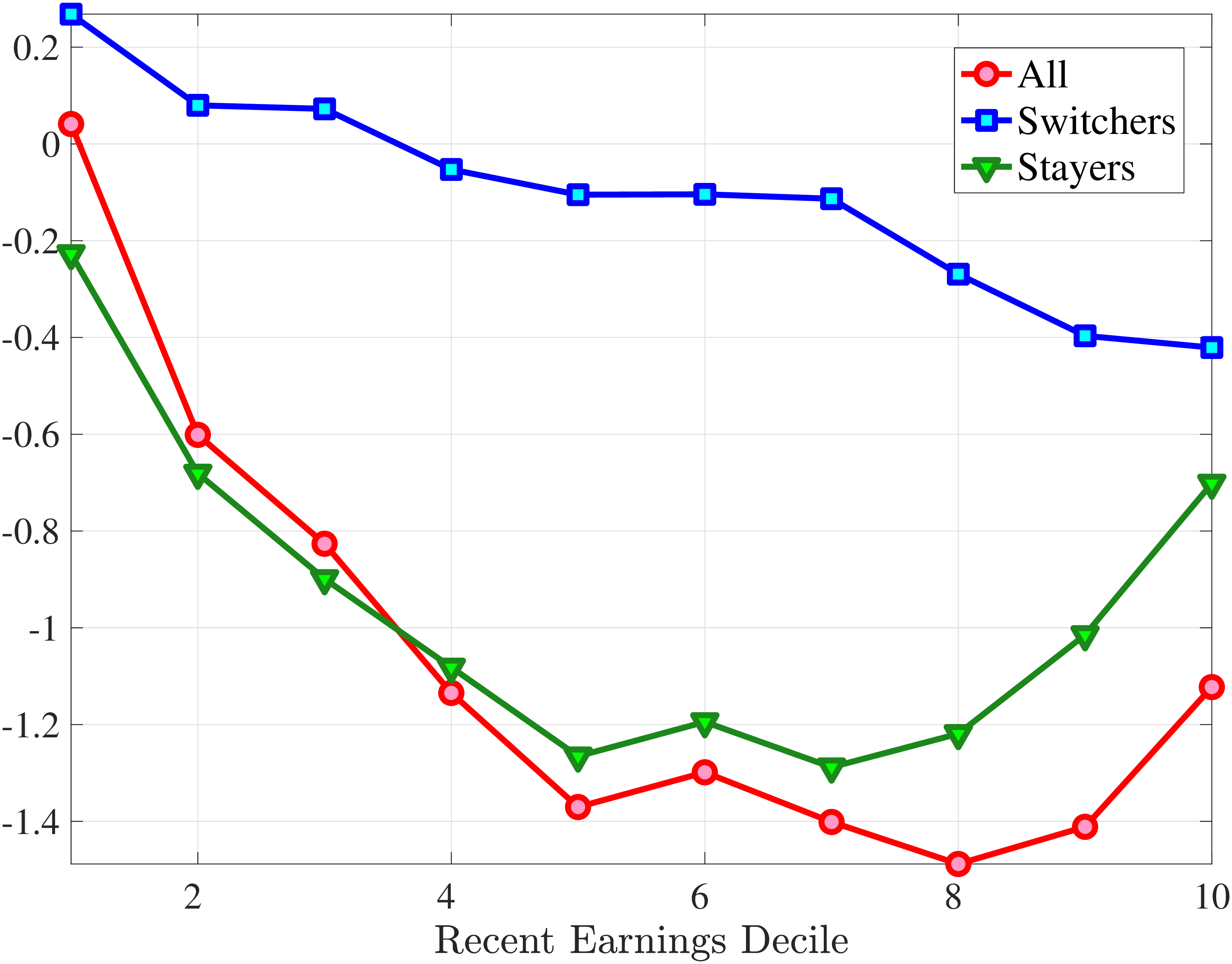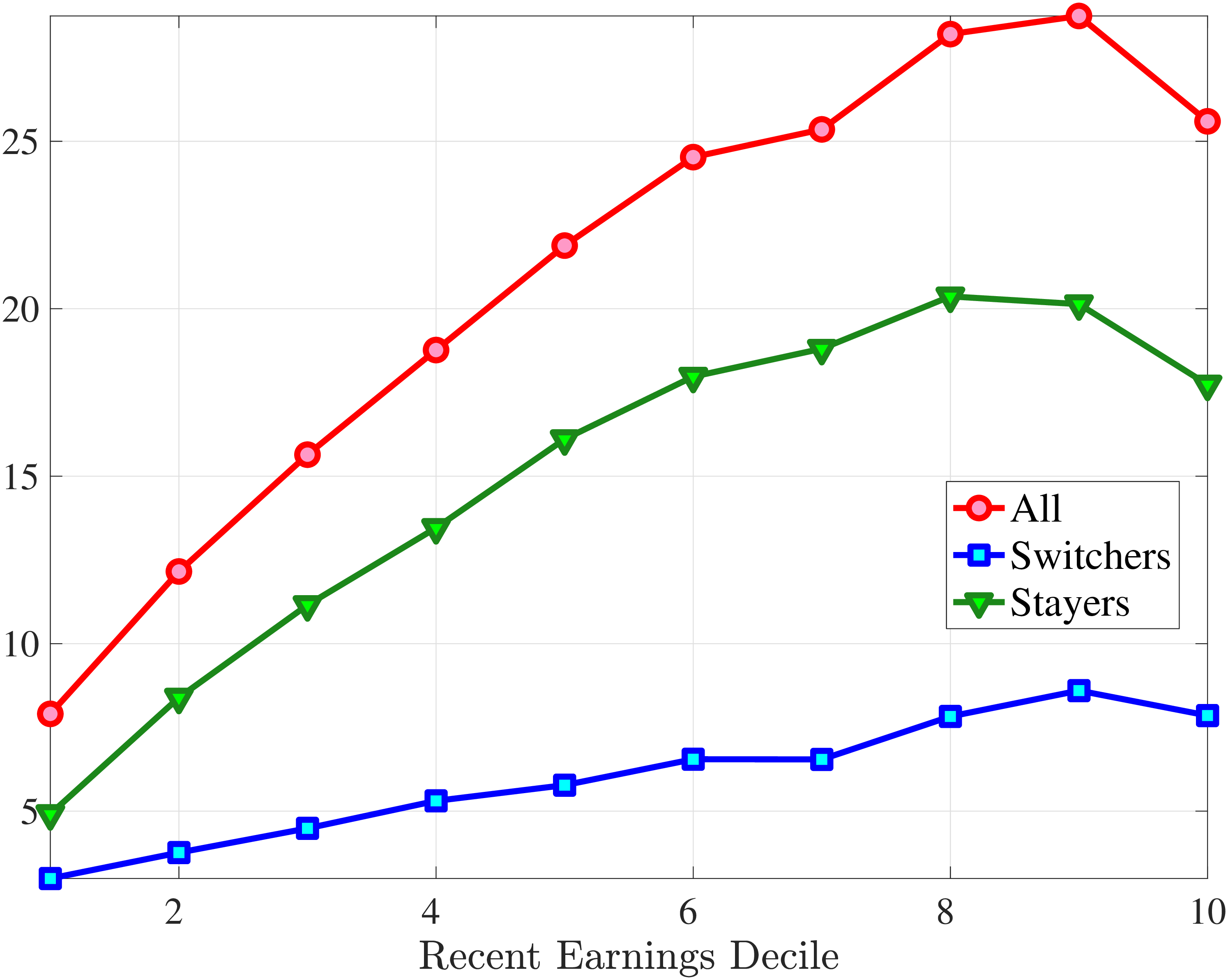 We focus on one-year earnings growth when analyzing stayers versus switchers since this approach allows for an unambiguous classification of switchers versus stayers.↩︎