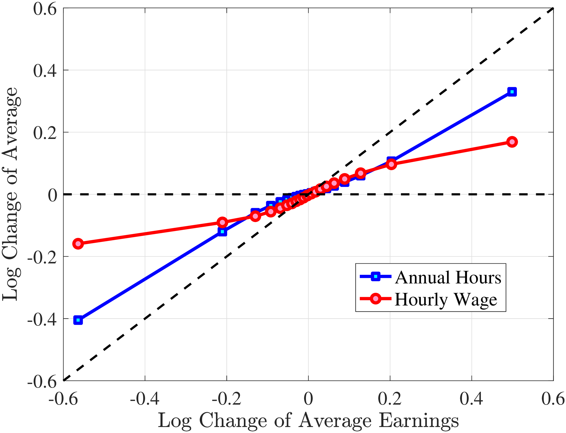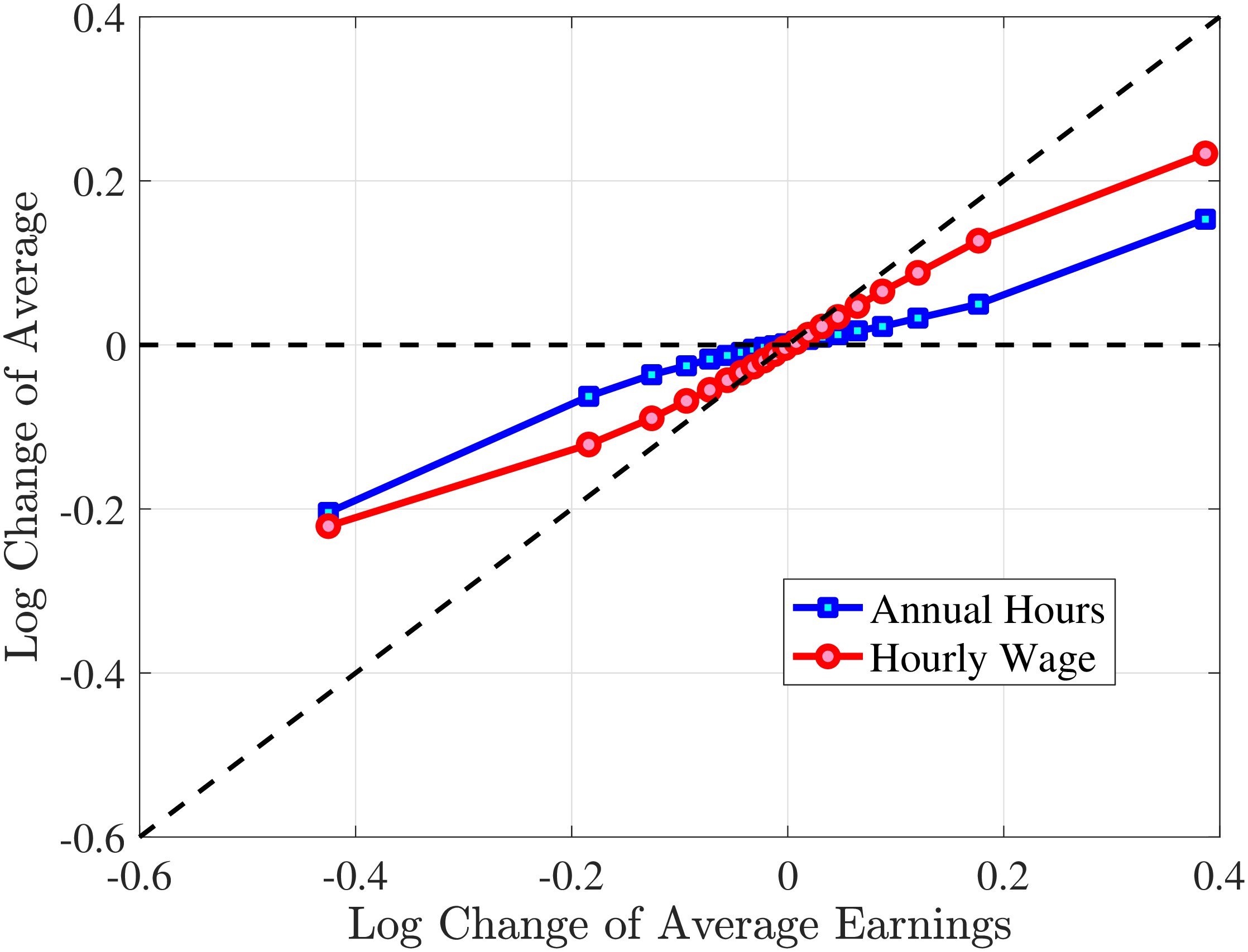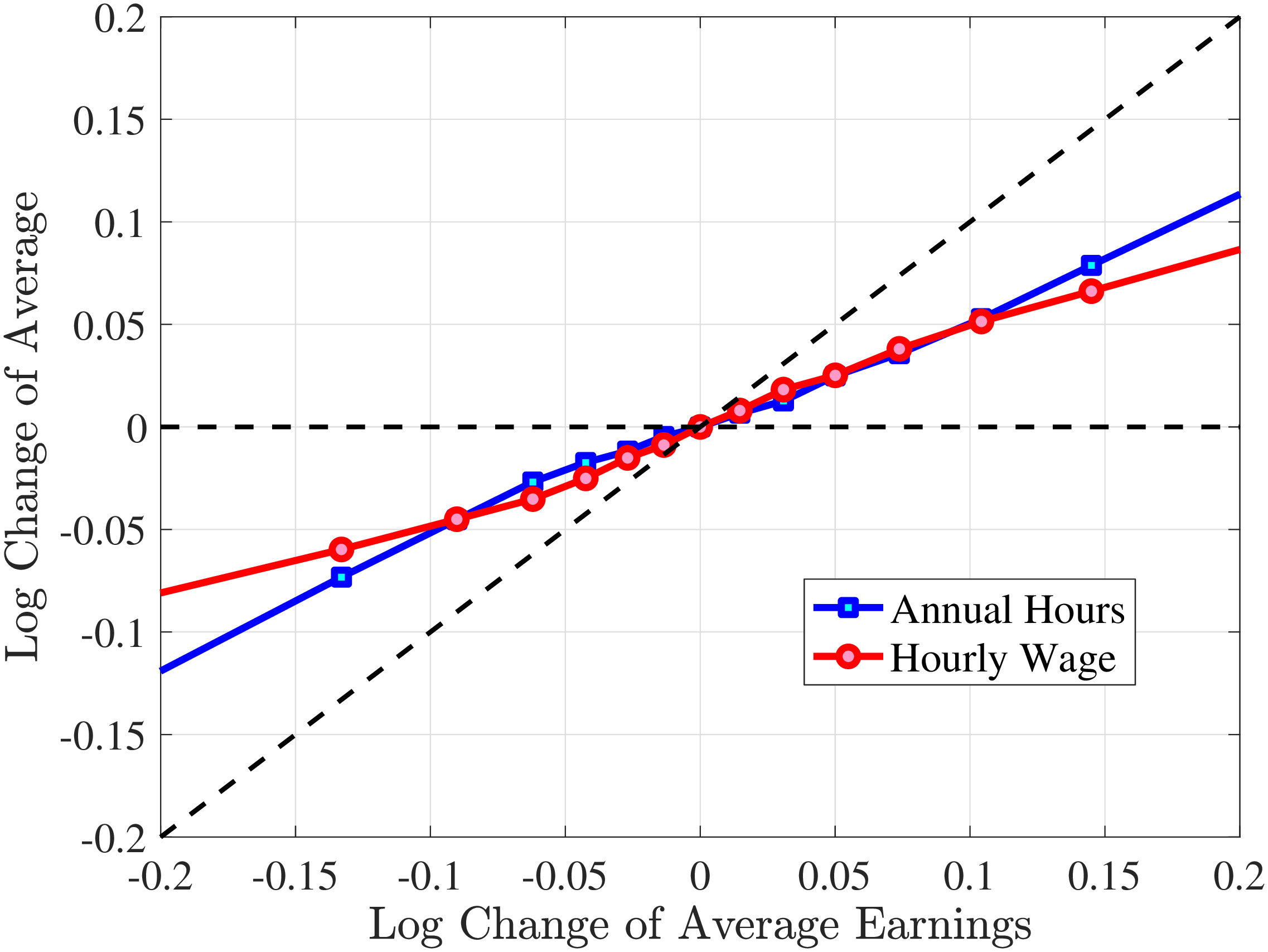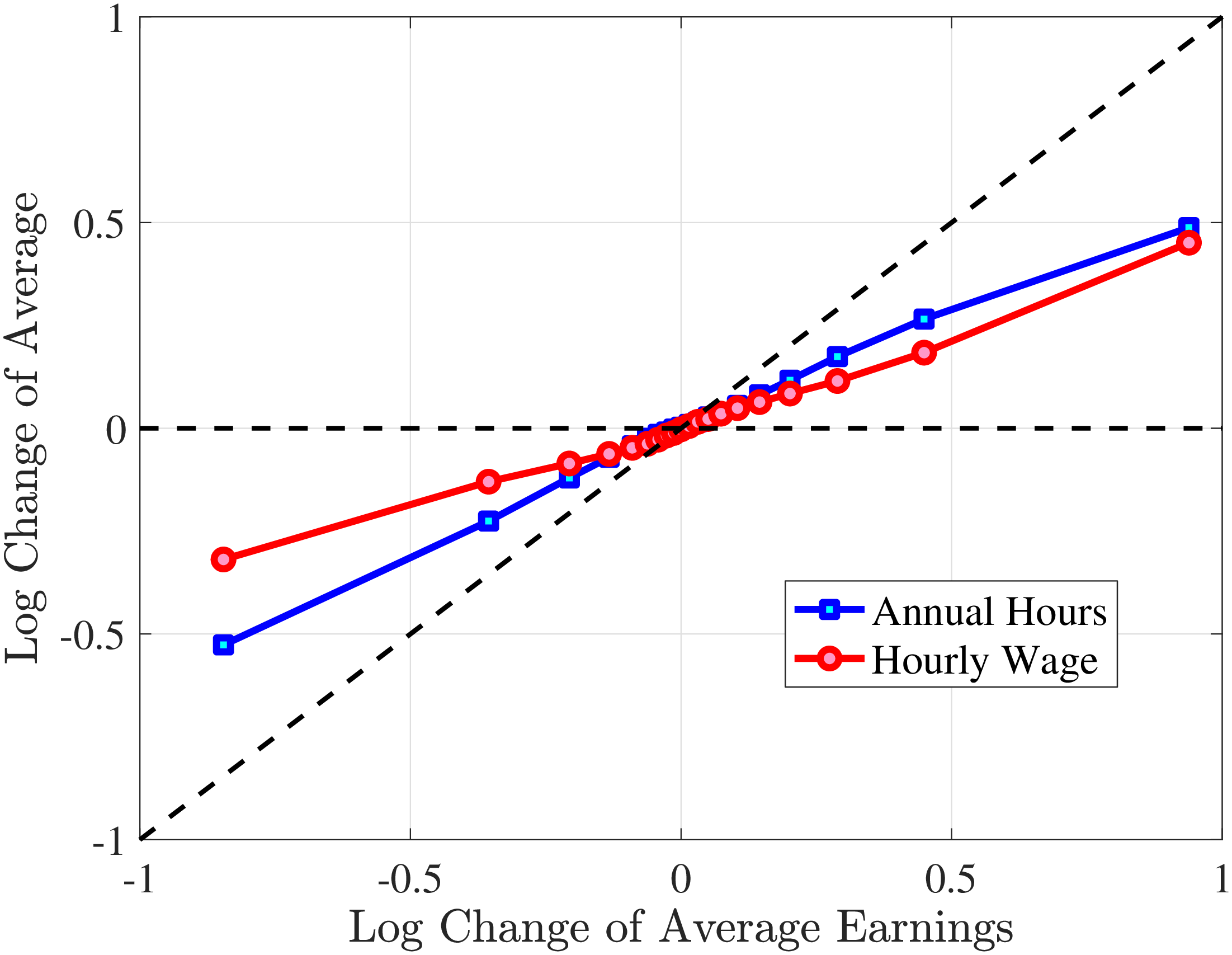 In Figure 2, we start with the 40% of prime-age males (36-55 years old) who are in the middle of the recent earnings distribution (i.e., the 4th to 7th deciles). The differences across these deciles are negligible. Note first that for large negative earnings changes, hours growth is roughly as large as wage rate growth. For example, the group of workers whose earnings decline around 60 log points on average experience a decline of about 30 log points in hours and a decline of 30 log points in wage rates. For large positive changes, the hourly wage rate increases slightly more than hours worked. Second, small earnings changes (both gains and losses) are mainly driven by wage changes. For example, for men who experience a loss of 10 log points in earnings, more than 70% of this loss is from a decline in wage rates. These results illustrate the heterogeneity in the covariance structure of wage and hours growth over the earnings change distribution.