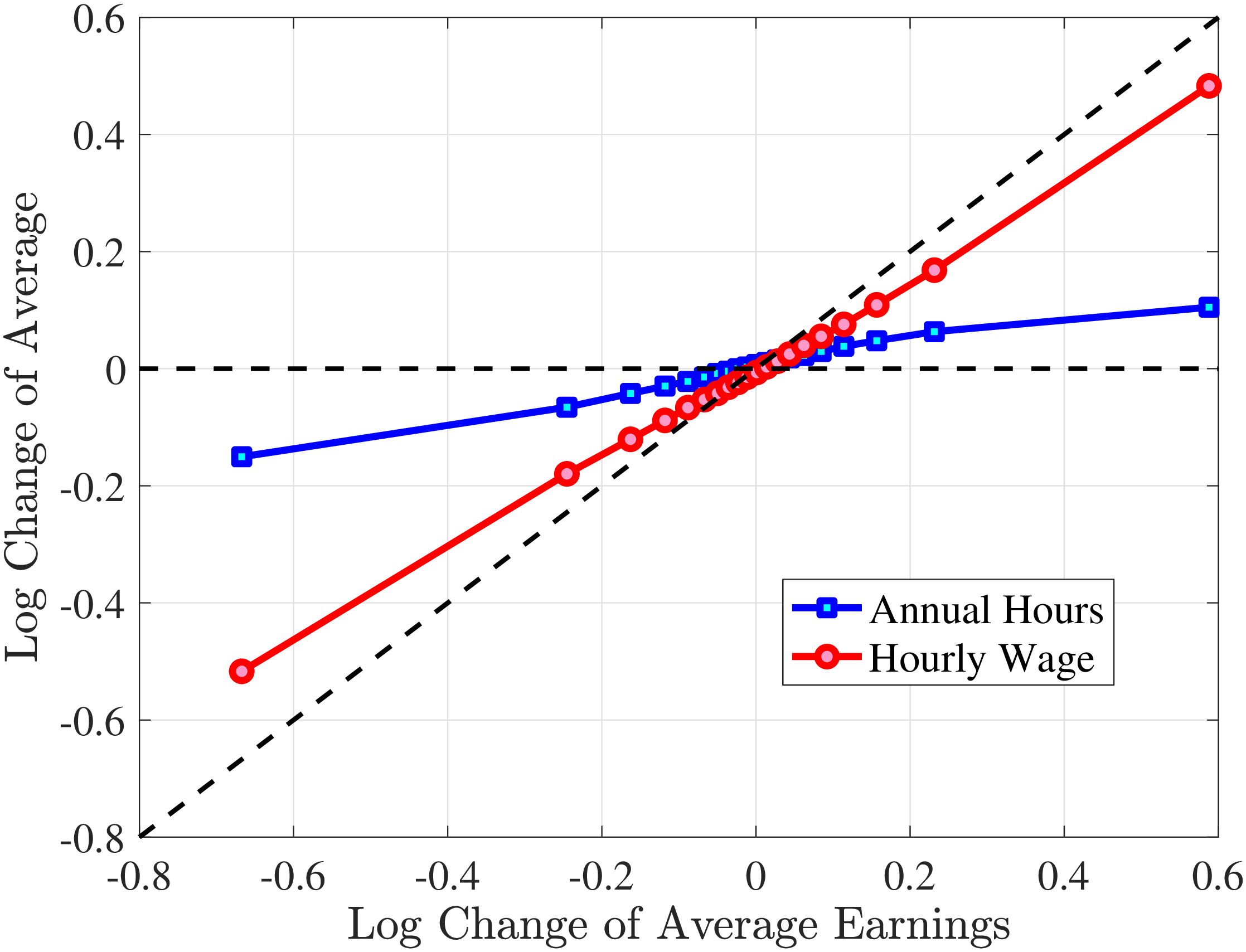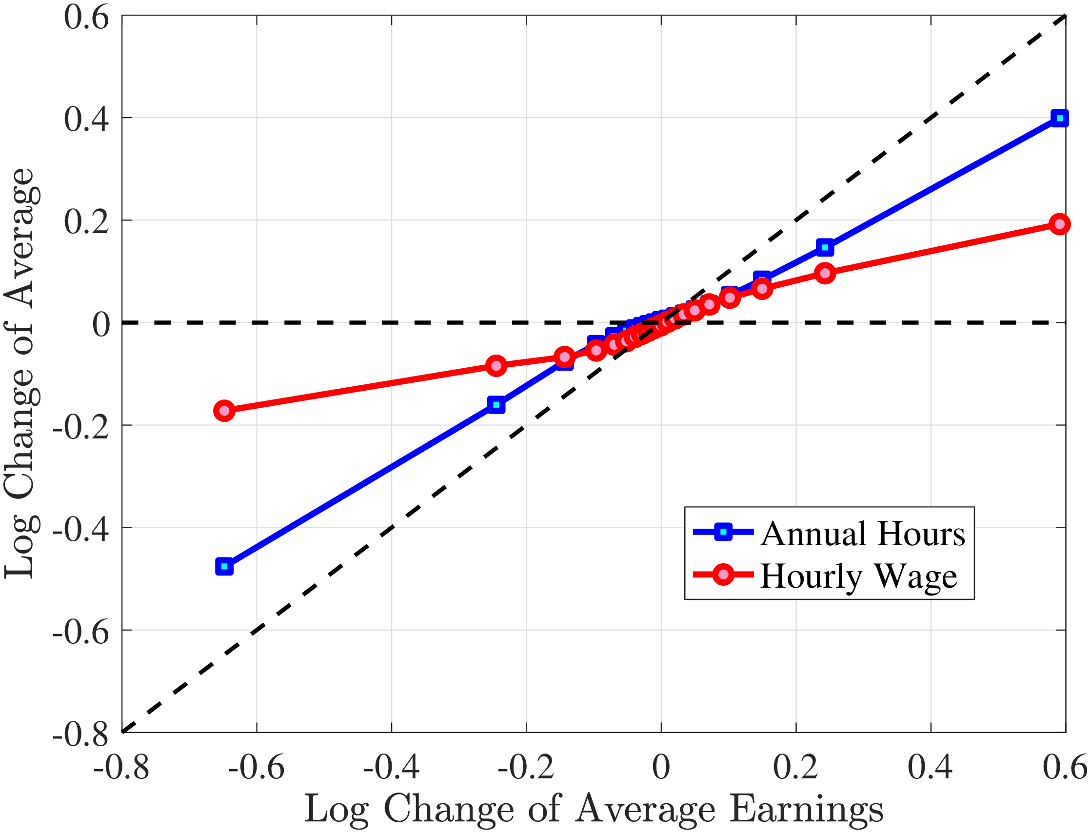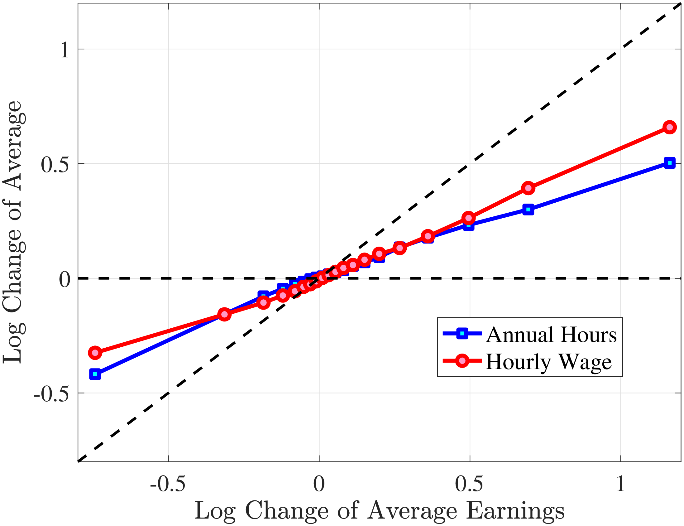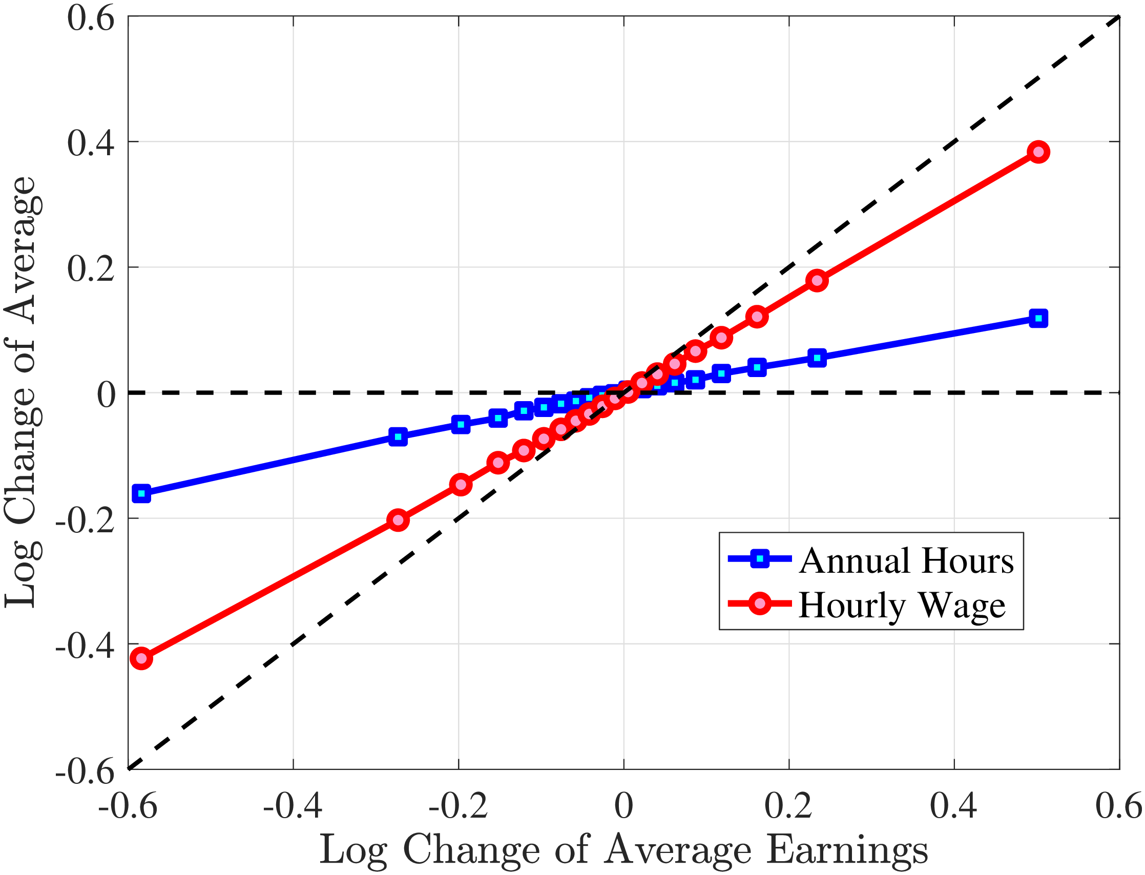 In Figure 2, we start with the 40% of prime-age males (36-55 years old) who are in the middle of the recent earnings distribution (i.e., the 4th to 7th deciles). The differences across these deciles are negligible. Note first that for large negative earnings changes, hours growth is roughly as large as wage rate growth. For example, the group of workers whose earnings decline around 60 log points on average experience a decline of about 30 log points in hours and a decline of 30 log points in wage rates. For large positive changes, the hourly wage rate increases slightly more than hours worked. Second, small earnings changes (both gains and losses) are mainly driven by wage changes. For example, for men who experience a loss of 10 log points in earnings, more than 70% of this loss is from a decline in wage rates. These results illustrate the heterogeneity in the covariance structure of wage and hours growth over the earnings change distribution.