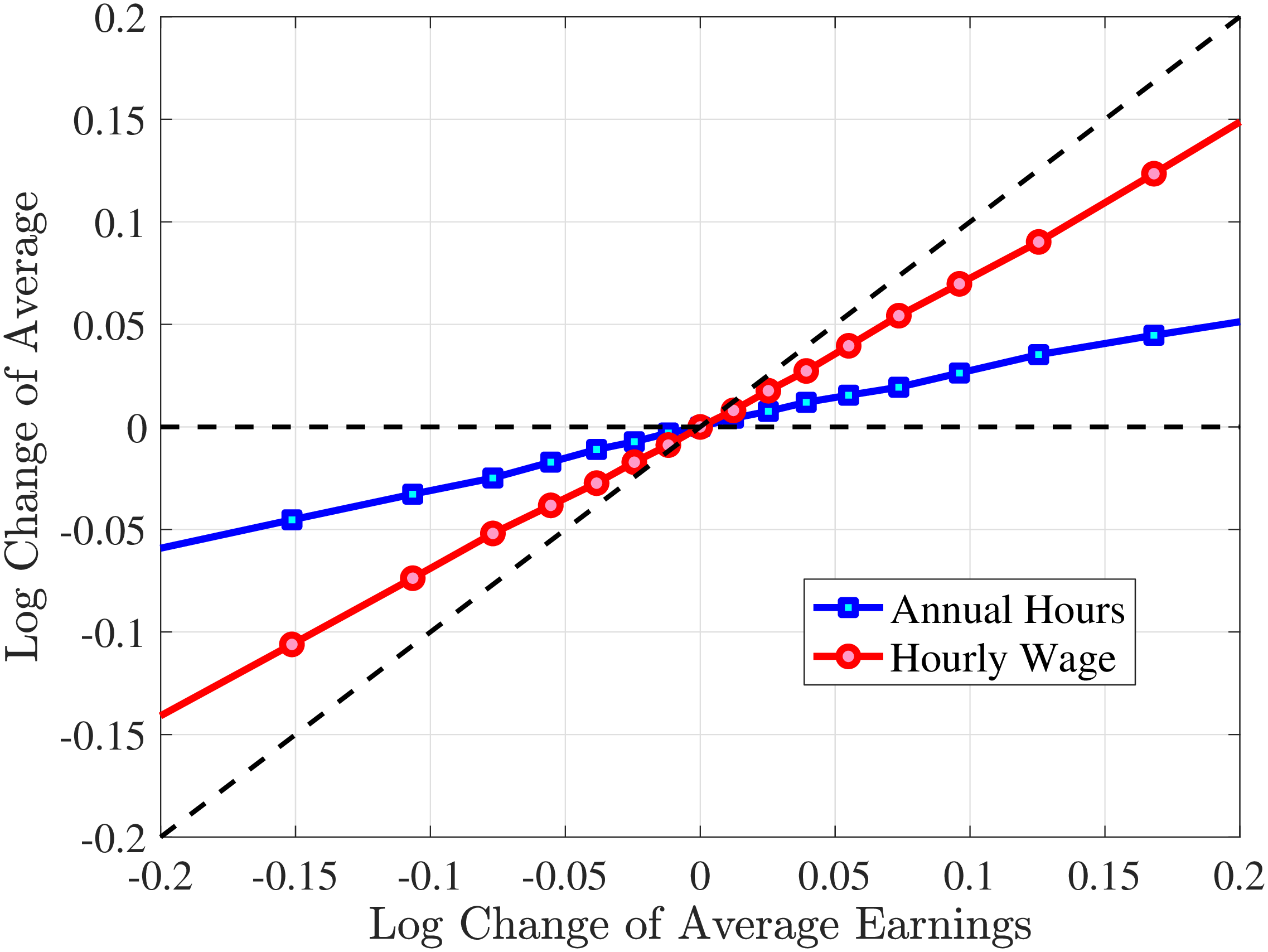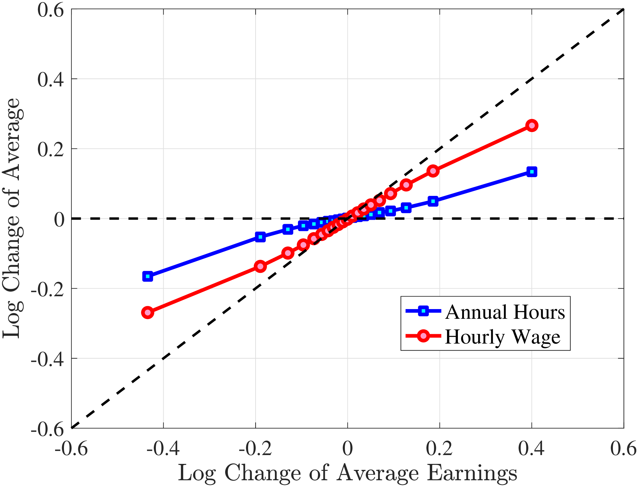 We measure the hourly wage rate as earnings/hours. This is the common approach in the literature (see, e.g., Heathcote et al. (2010a), Heathcote et al. (2014), Bick et al. (2022)) as wage rates are rarely directly observable in the data. We proceed by decomposing earnings changes into changes in hours worked versus hourly wages. To this end, we group them with respect to their earnings growth (in addition to conditioning workers with respect to age and recent earnings \(\bar{Y}_{t-1}^{i}\)).22 In particular, within each age and RE group, we rank workers on their earnings growth from \(t\) to \(t+1\) and sort them into 20 different quantiles. We treat each such finely defined group as homogeneous and plot the growth of their average hours and hourly wages on the y-axis conditional on their earnings growth between \(t\) and \(t+1\) on the x-axis.23 To control for age effects and differences in mean reversion between different groups of workers, we normalize changes on both the x- and y-axes such that their values at the median quantile cross at zero.