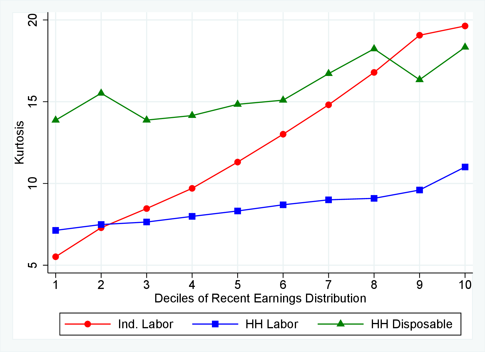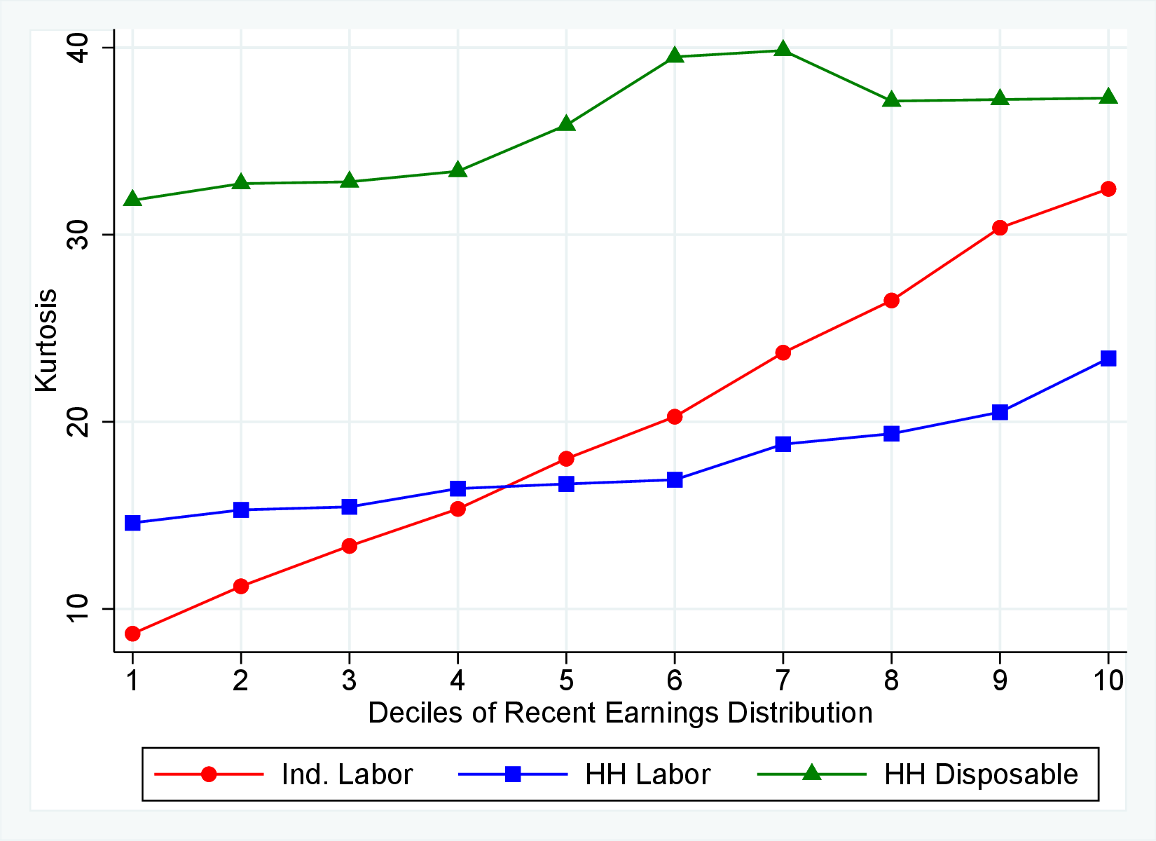 When investigating the distribution of (idiosyncratic) shocks (in Section 5), we focus instead on a measure of individual growth because we are interested in the higher-order moments of dynamics in outcomes for individuals. We work with the log growth rate in individual-specific variables between \(t\) and \(t+k\): {}{k}z_{t}{i}z{t+k,h+k}{i}-z{}_{t,h}{i}, where \(z_{t}^{i}\equiv \log Z_{t,h}^{i}-d_{h}^{z}\) denotes the log of variable \(z\) net of age effects of the same variable. This is a widely used growth rate measure, and its higher-order moments for a log-normal distribution are familiar to most readers (zero skewness and a kurtosis coefficient of 3). Recall that our sample includes observations with labor earnings above \(5\%\) of median earnings. Thus, when calculating \(\Delta _{\log}^{k}z_{t}^{i}\), we drop individuals from the base sample whose observations are below the cutoff in either \(t\) or \(t+k.\)21