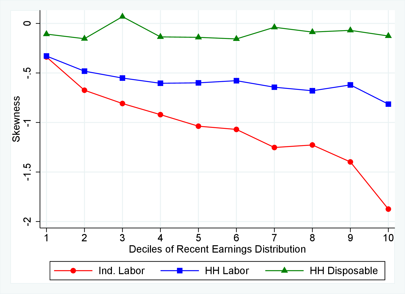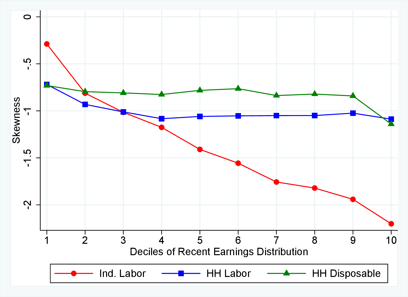 Finally, we examine how the dynamics of household earnings and disposable income differ from male earnings dynamics. Disposable income is substantially less volatile than male earnings because of spousal and public insurance. Relatedly, growth in household earnings and disposable income is less negatively skewed, with disposable income growth being approximately symmetrically distributed. Thus, we conclude that the Norwegian system of taxes and transfers provides substantial insurance against tail risk in income.
