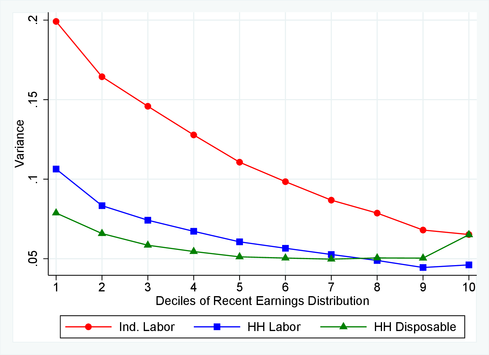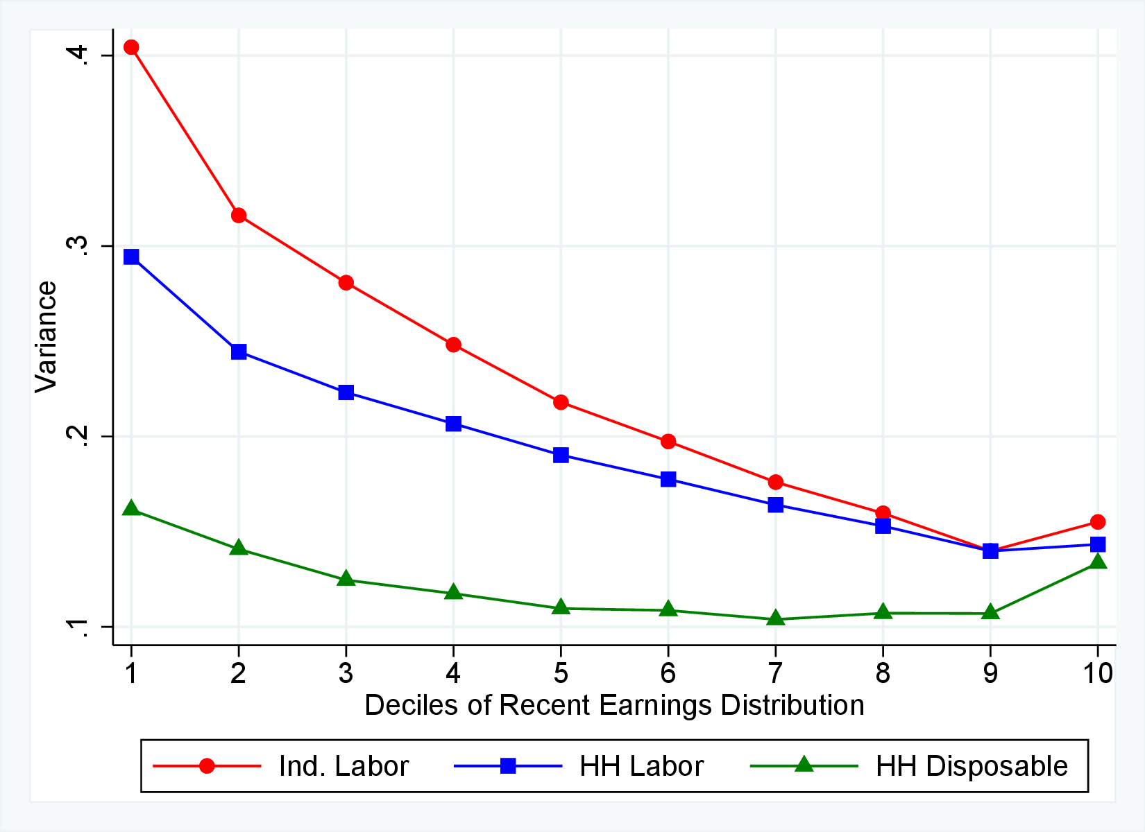 They also calculate individual disposable labor income and find that the variances of shocks to individual disposable income are just slightly larger than those of household disposable labor income.↩︎